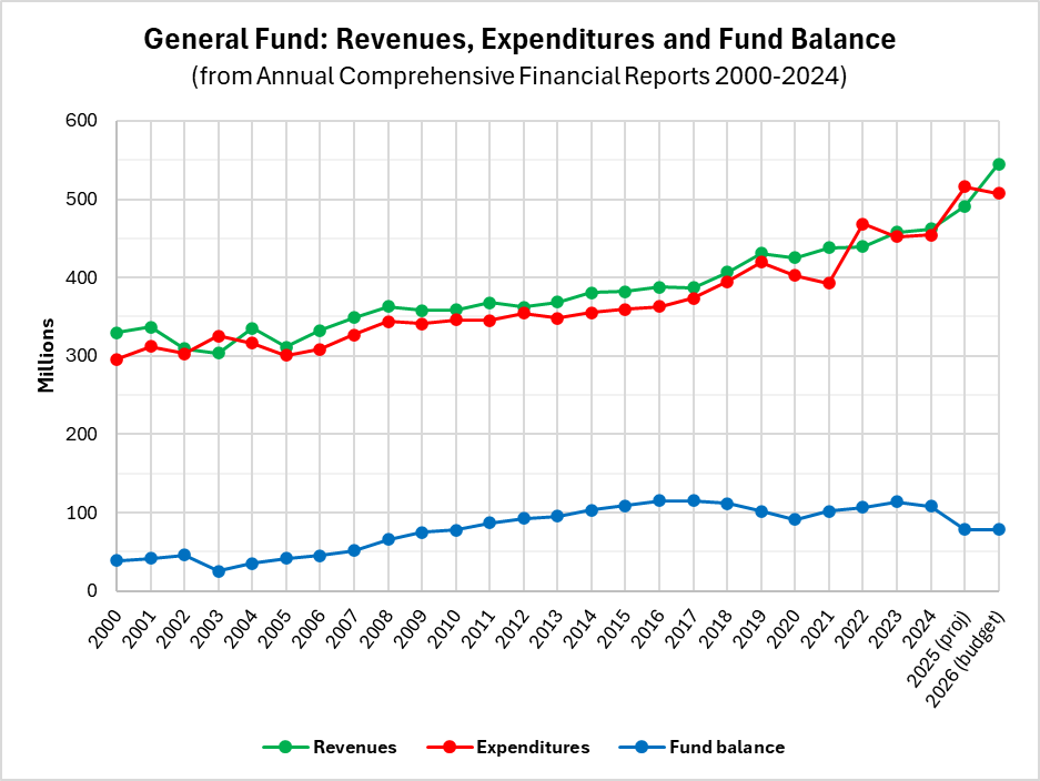General fund revenues (in green) should generally rest above expenses (in red), so that the fund balance (in blue) is high enough to endure lean months and emergencies.