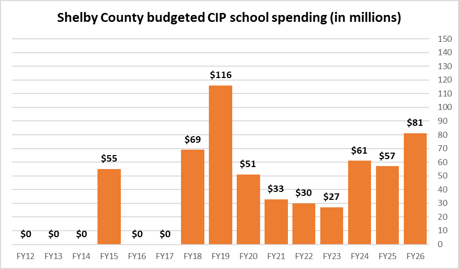 Shelby County’s long term debt is held in check by the county’s CIP spending policy, which is currently capped at $150 million annually, doubled from $75 million in FY24. Over the next 20 years, this spending level would total $3 billion, covering only a third of an estimated $10 billion in infrastructure costs Shelby County could face over that period, including schools, Regional One and the jail/criminal justice center.